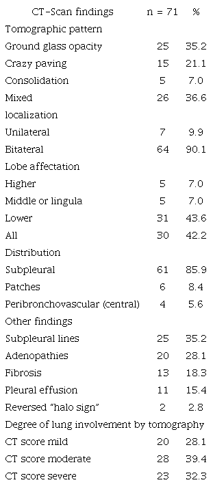 Abstract: Chest imaging (CT) plays an important role in the detection and diagnosis of covid-19. The objective of this study is the local experience of CT-based semi-quantitative score of lung involvement as well as the clinical staging in covid-19 patients at the Specialty Medical Institution No. 71 (UMAE, from its Spanish acronym). This is a single-center, retrospective study, in which 71 patients (44 men, 27 women; mean age 50 ± 14.1, range 25-84 years) were selected with positive tests of RT-PCR for SARS-CoV-2 and a confirmed diagnosis of covid-19. Chest CT images showed as predominant pattern the mixed pattern (n = 26, 36.6%), and other common findings included ground glass opacities (GGO) (n = 25, 35.2%), crazy paving (n = 15, 21.1%), and lung consolidation (n = 5, 7.0%). The chest computed tomography findings were bilateral lesions (n = 64, 90.1%), subpleural distribution (n = 61, 85.9%), and lower lobes (n = 31, 43,6%). The characteristic pulmonary tomographic pattern was ground-glass opacities and a bilateral mixed pattern of peripheral distribution towards the posterior regions.