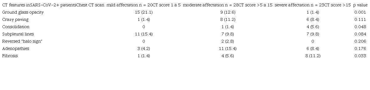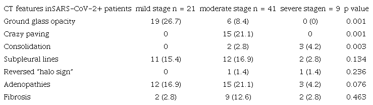 The characteristics of the chest tomography and the clinical classification of covid-19 according to the severity of the symptoms in this group of patients was that the GGO tomographic pattern was significantly more prevalent in the mild clinical stage (19 patients, 26.7%; p <0.001), while the crazy paving tomographic pattern (15 patients, 21.1%; p < 0.001) in the moderate clinical stage and pulmonary consolidation (three patients, 4.2%; p < 0.003) were significantly more frequent in the severe clinical stage of this group of patients (Table 4).