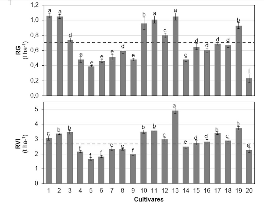 El rendimiento potencial en vainas (RVI) y grano (RG) de los 20 cultivares de frijol caupí se muestra en la Figura 1. El RVI varió entre 1.7 t ha-1 a 4.9 t ha-1 con una media de 2.9 t ha-1 entre los cultivares evaluadas. El cultivar 13 resultó con el RVI más elevado, seguida de los cultivares 2, 3, 10, 11, 17 y 19 con un rendimiento moderado de 3 t ha-1 a 4 t ha-1. En los cultivares 4, 5, 6 y 9 el RVI fue menor. En la variable RG se observaron valores entre 0.2 t ha-1 a 1.1 t ha-1 con una media de 0.7 t ha-1. Los cultivares 1, 2, 11 y 13 registraron los valores más elevados con 1.1 t ha-1, 1.1 t ha-1, 1.0 t ha-1 y 1.1 t ha-1 respectivamente (Figura 1).