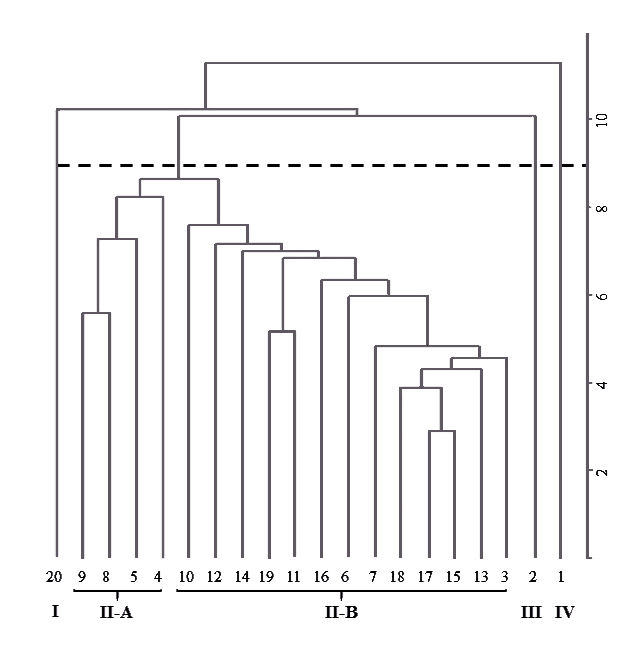 En análisis de conglomerados resultó con una correlación cofenética de 0.93 entre los cultivares (Figura 2). Se encontraron cuatro grupos definidos a una distancia de 9.0 unidades. El grupo I está conformado por el cultivar 20 que se distingue por poseer un HC semi-erecto con pocas ramas (NRP = 2.6) de ciclo corto (DF = 43 dds) y flores de color blanco. Las vainas son de tamaño regular (LV = 21 cm) pero con pocos granos (NGV = 13). Las semillas son de gran tamaño (LS = 8.6 mm, AS = 6.2 mm) y peso (P100s = 16.5g), de color blanco con el hilum de color marrón tostado. El grupo II está conformado por 17 cultivares y se divide en dos sub grupos. El subgrupo II-A con 4 cultivares (4, 5, 8 y 9), se caracterizan por poseer 4 a 5 ramas principales, en su mayoría son de ciclo intermedio (DF = 48-51 dds), con flores blancas. Las vainas son de tamaño regular (LV = 18 cm-20 cm) con 17 a 18 granos por vaina. Las semillas son de forma reniforme de pequeño tamaño y bajo peso (P100s = 10 g-12 g) de color crema con el hilum de color negro. El subgrupo II-B cuenta con 13 cultivares (3, 6, 7, 10, 11, 12, 13, 14, 15, 16, 17, 18 y 19) y se caracterizan por poseer 4 a 7 ramas principales, en su mayoría de ciclo intermedio con flores de color violeta. Las vainas son de tamaño regulares y pesadas, con 16 a 20 semillas por vaina. Las semillas tienen en su mayoría forma reniforme y un color negro. Son de un tamaño y peso regular. El grupo III está conformado por el cultivar 2 que se caracteriza por poseer un número elevado de ramas (NRP = 8.7), sus hojas son largas (LHT = 13.8 cm), con una forma hastada. Su ciclo es largo (DF = 69 dds) y las flores de color blanco. Las vainas son cortas (LV = 16.9 cm) y con pocos granos (NGV = 15). Las semillas son reniformes, de color crema con el hilum de color negro. Son de tamaño y peso regular. El grupo IV está conformado por el cultivar 1 que se distingue por poseer un HC erecto, PC determinado y pocas ramas (NRP = 2.7). Tiene un ciclo corto (DF = 39 dds) y flores de color violeta. Las vainas son de tamaño regular y ligeras (P100V = 509 g), con pocos granos (NGV = 14). Las semillas tienen una forma ovoide, de gran tamaño (GS = 4.9 mm) y peso (P100s = 13.7g) con un color crema marrón.