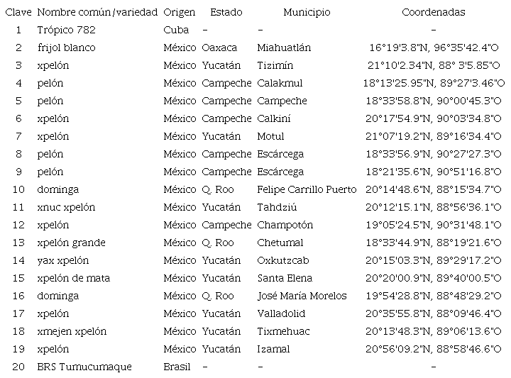 Se evaluaron 18 cultivares de frijol caupí provenientes del sur de México. Se realizaron ocho colectas en el estado de Yucatán, seis colectas en el estado de Campeche, tres colectas en el de Quintana Roo y una en el de Oaxaca. Las colectas se realizaron directamente con los productores. Además, se evaluó la variedad “Trópico 782” introducida de Cuba y cultivada en la región (Castillo, 2007) y la variedad BRS Tumucumaque de Brasil (De Oliveira et al., 2014) para un total de 20 cultivares (Tabla 1).