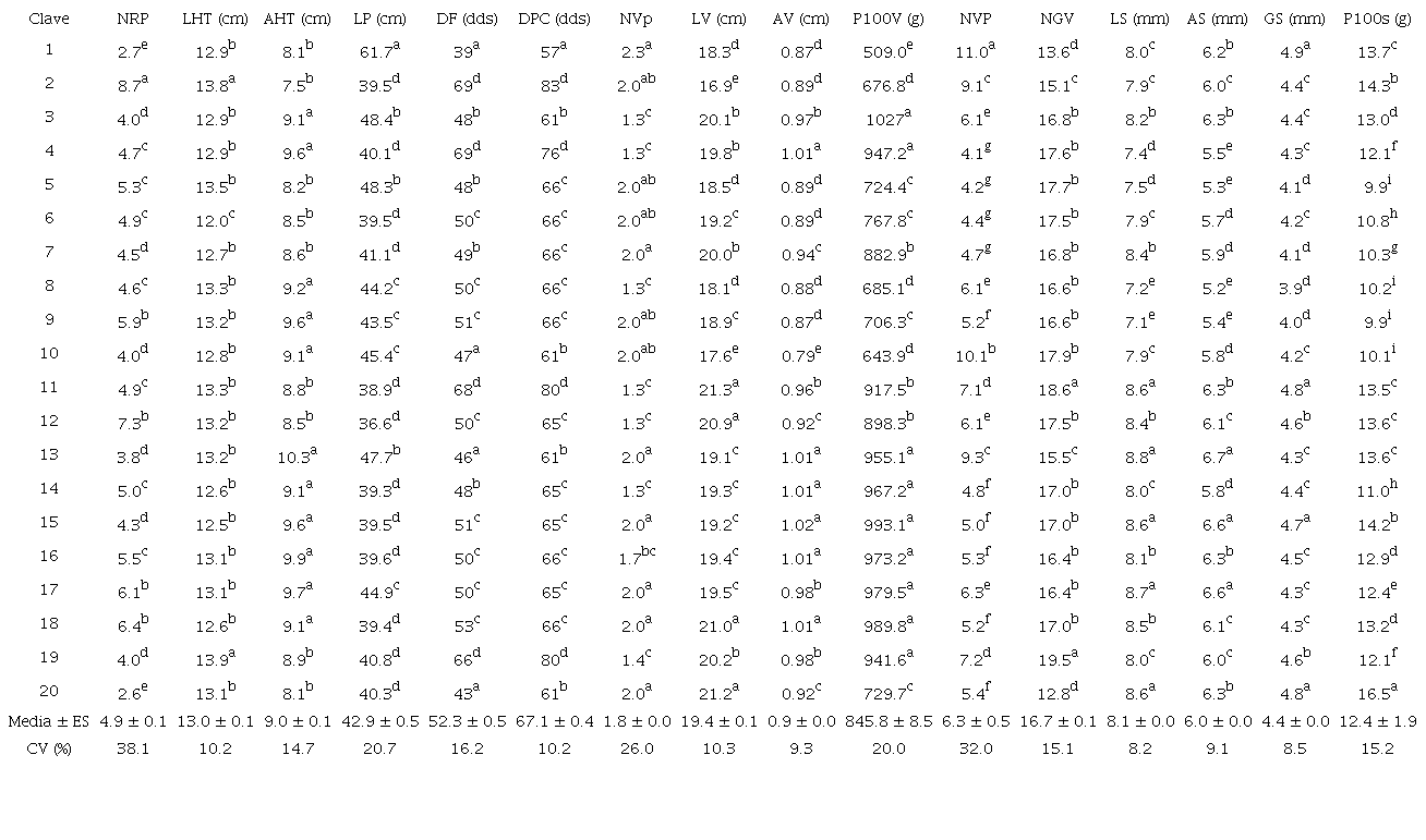 El número de ramas varió de 2.6 a 8.7 con un valor medio de 4.5 ramas. Los cultivares 1 y 20 resultaron con el menor valor y el cultivar 2 resultó con mayor número de ramas. El largo y ancho de la hoja terminal variaron entre 12.0 cm a 13.9 cm y 7.5 cm a 9.9 cm, respectivamente. El cultivar 2 resultó con hojas más largas y estrechas que corresponde a una forma hastada. Los cultivares 13 y 16 resultaron con hojas más anchas y de gran tamaño. La LP varió entre 36.6 cm y 61.7 cm, con un valor medio de 42.9 cm, presentando el cultivar 12 el valor mínimo y el cultivar 1 el valor máximo. Las variables DF y DPC variaron entre 39 dds a 69 dds y 57 dds a 83 dds respectivamente. El cultivar 1 fue el más precoz con aproximadamente ocho semanas a cosecha mientras que los cultivares 2, 4, 11 y 19 resultaron más tardías, necesitando más de 11 semanas a cosecha. El NVp varió entre 1.3 a 2.3 vainas, con una media de 1.8 vaina por pedúnculo. El mayor NVp se observó en el cultivar 1 mientras los cultivares 3, 4, 8, 11, 12 y 14 resultaron con menor NVp. Las variables LV y AV variaron entre 16.9 cm a 21.3 cm y 0.79 cm a 1.02 cm, respectivamente. Los cultivares 11, 20, 18 y 12 resultaron con las vainas más largas, mientras que el cultivar 2 con las vainas más cortas. En la variable P100V se observaron valores entre 509 g a 1027 g, con una media de 845.8 g. El cultivar 1 resultó con menor peso de vaina, mientras que el cultivar 3 registró el valor máximo, estadísticamente similar a los cultivares 4, 13, 14, 15, 16, 17, 18 y 19. El NVP varió entre 4 a 11 vainas, con una media de 6.3 vainas. El cultivar 1 registró el mayor número de vainas, mientras que los cultivares 4, 5, 6 y 7 produjeron apenas 4 a 5 vainas. El NGV varió entre 12.8 a 19.5 granos, con una media de 16.7 granos por vaina. El menor valor se observó en el cultivar 20 mientras que el mayor valor en el cultivar 19. En las variables evaluadas en la semilla, el LS y AS variaron entre 7.11 mm a 8.78 mm y 5.23 mm a 6.69 mm respectivamente. Los cultivares 13, 17 y 15 destacaron en las variables LS y AS con semillas de mayor tamaño. Los cultivares 8 y 9 resultaron con semillas de menor tamaño. El valor máximo en GS se observó en el cultivar 1 con 4.90 mm, mientras que el valor mínimo se observó en el cultivar 8 con 3.94 mm. La variable P100s registró valores entre 9.9 g a 16.5 g, con una media de 12.4 g. El cultivar 20 resultó con el valor más elevado, mientras que los cultivares 9, 5, 10 y 8 registraron el menor P100s (Tabla 2).