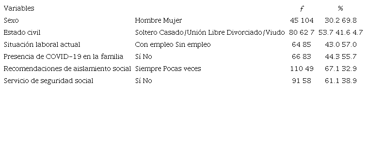 La muestra se conformó por 149 adultos voluntarios de entre 18 y 65 años, de los cuales 104 fueron mujeres y 45 fueron hombres. Debido a que la entrevista fue en línea y con la finalidad de disminuir sesgos en la selección de la muestra, se contó con preguntas filtro como lugar y fecha de nacimiento, residencia y, en el caso de las mujeres, se indagó si estaban embarazadas. La edad promedio fue 29.26 años (DE = 9.84). Con respecto a la escolaridad, el 14.8% mencionaron haber terminado la secundaria y 14.8% el bachillerato, 49% mencionaron tener o cursar una carrera universitaria y el 21.4% contaba con estudios de posgrado.