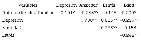 Con el propósito de responder el objetivo general del estudio sobre determinar la relación entre rutinas de salud familiar y la presencia de síntomas emocionales, el análisis de correlación estableció una relación negativa entre las rutinas de salud con los síntomas de ansiedad (rs= -0.236, p = 0.004) y sintomatología depresiva (rs= -0.191, p = 0.020), pero positiva con la edad (rs= 0.209, p = 0.011) (Tabla 2). La sintomatología depresiva estuvo relacionada positivamente con los síntomas de estrés (rs= 0.816, p = 0.000) y ansiedad (rs= 0.738, p = 0.000) e inversamente con la edad (rs= -0.296, p = 0.000); así mismo, se encontró que los síntomas de ansiedad y estrés se correlacionan positivamente (rs= 0.785, p = 0.000).