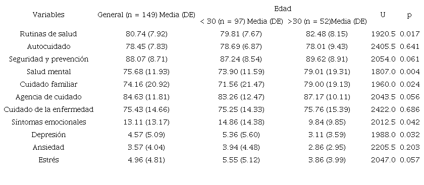 Al analizar las diferencias de las variables de acuerdo con la edad, se encontraron diferencias significativas (p < 0.05), donde las mayores puntuaciones de rutinas de salud y subescalas de salud mental y cuidado familiar se presentaron en los participantes > 30 años. Por el contrario, los participantes más jóvenes (< 30 años) reportaron más síntomas emocionales, especialmente sintomatología depresiva (Tabla 3).