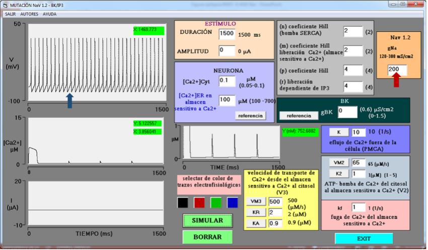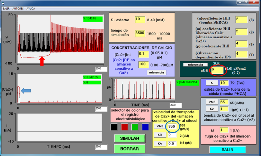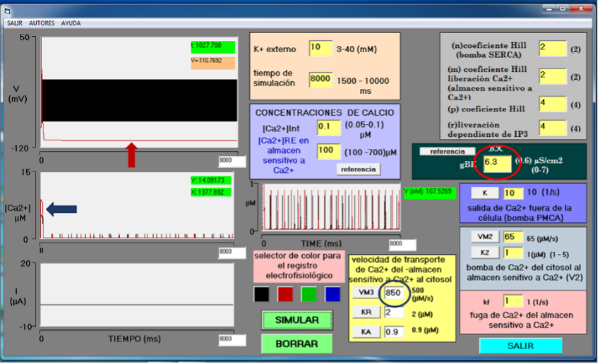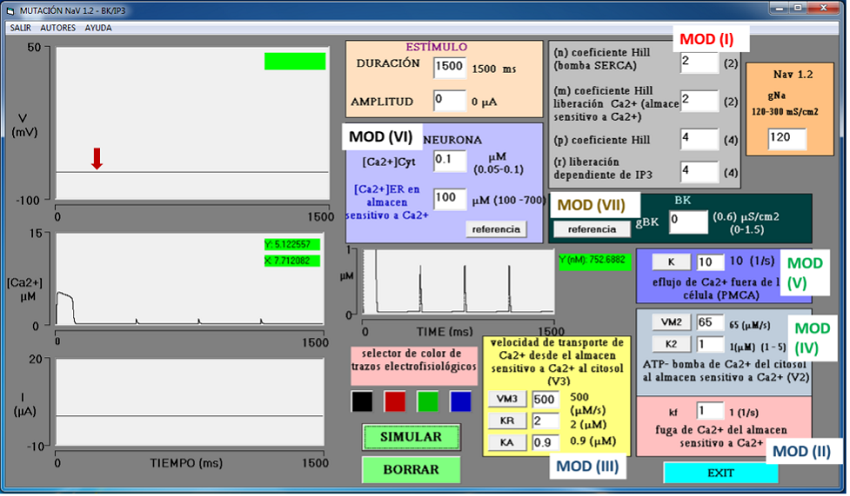 Los dos simuladores cuentan con seis módulos (MOD) iguales para la entrada de datos (Figura 1): MOD I es el módulo de IP3 y gestión de oscilaciones de calcio intracelular que muestra las variables: n, m, p y r con valores iniciales de 2, 2, 4 y 4, respectivamente; MOD II es el módulo de salida de calcio hacia el citosol desde el almacén sensible a calcio, muestra la variable de fuga de calcio kf con valor inicial de 1 1/s; MOD III es el módulo de velocidad de salida de calcio por IP3, donde se encuentra la variable V3, relacionada con VM3, KR y KA con valores iniciales de 500 µM/s, 2 µM y 0.9 µM, respectivamente. MOD IV es el módulo para disminución de calcio intracelular por la bomba ATP (SERCA), bomba que ingresa calcio del citosol al almacén sensitivo a calcio, en este módulo se muestra las variables VM2 y K2 con valores iniciales de 65 µM/s y 1 µM, respectivamente; y MOD V es el módulo para la bomba PMCA que produce un eflujo de calcio hacia el espacio extracelular, aquí se muestra la variable K con valor inicial de 10 s-1. Los valores iniciales de estos cinco módulos derivan de Keener y Sneyd (Keener & Sneyd, 1998). MOD VI es el módulo que determina las concentraciones libres de calcio en el citoplasma y en el retículo con [Ca2+] = 0.1 µM y 100 µM, en el citosol y el retículo endoplásmico, respectivamente (Foskett et al., 2007). Estas condiciones propician una salida abrupta de Ca2+ del retículo, con una duración corta a manera de destello (spark) (Cheng & Lederer, 2008). Estos módulos corresponden a las variables que gobiernan el modelo de Goldbeter (1990). Finalmente, MOD VII es el módulo que determina la presencia de canales BK en la neurona, con variable gBK, con valores iniciales de 0 µS/cm2, condición control, sin canales BK (Figura 1).