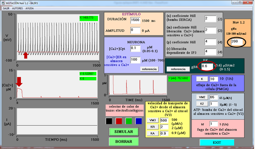 Se propone que el complejo BK/IP3-R es un sistema intrínseco que juega un papel importante en la finalización de la actividad eléctrica epiléptica de la neurona. Si esto es así, entonces deberá detener el estado epiléptico. Se realizó el siguiente experimento virtual. A la neurona epiléptica anterior se le mantuvo el incremento de gNa = 200 mS/cm2 con la finalidad de continuar con el estado epiléptico. La Figura 3 muestra dos simulaciones superpuestas: (1) la simulación donde se generó epilepsia (tren de PA en el osciloscopio superior, por mutación de NaV 1.2, gNa = 200 mS/cm2, gBK = 0 µS/cm2) y (2) la simulación donde se agregaron canales BK a la neurona (gBK = 0.6 µS/cm2); el complejo BK/IP3-R ahora está completo y activo. En esta última condición, se puede observar cómo la salida abrupta de calcio (flecha roja en el osciloscopio central) activa a los canales BK (gBK = 0.6, circulo en rojo). Como resultado, se detiene la actividad eléctrica epiléptica de la neurona (trazo en rojo en el osciloscopio superior, señalado por la flecha). Todas las demás variables mantienen los valores de la neurona epiléptica anterior.