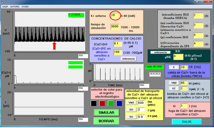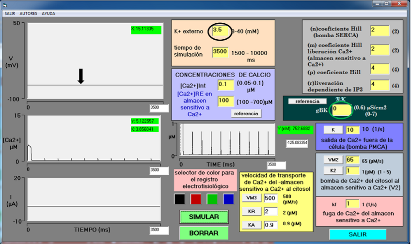 Este simulador cuenta con un módulo de entrada de datos específico, donde se puede aumentar la concentración de potasio externo y el tiempo de simulación. Los valores iniciales para estas variables al ejecutarse el simulador son: [K+]e = 3.5 mM (círculo negro) y un tiempo de simulación de 3500 ms. Las demás variables permanecen con valores iniciales descritos arriba. En estas condiciones la neurona no dispara potenciales de acción, es silente (Figura 4, flecha negra).