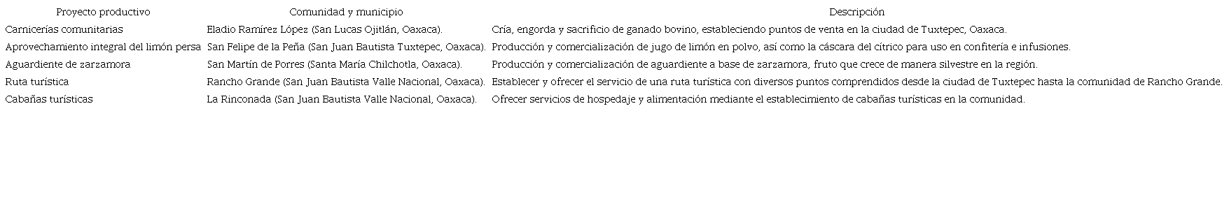 A partir de todo lo comentado anteriormente, la Tabla 1 muestra las propuestas de proyectos que surgieron e intentaron desarrollar los estudiantes; estas se caracterizaron por estar situados en el espacio local (agencias municipales)1, en forma de pequeños negocios, unidades de producción familiar, microempresas u otra figura de carácter local, pues se comparte la opinión de Báez-Hernández et al. (2018) en el sentido de que los proyectos productivos impulsan y fortalecen la producción y el desarrollo local al generar empleos, incorporar a la mujer al trabajo y explotar y usar racionalmente los recursos disponibles en la elaboración de bienes en beneficio de este sector de la población.
