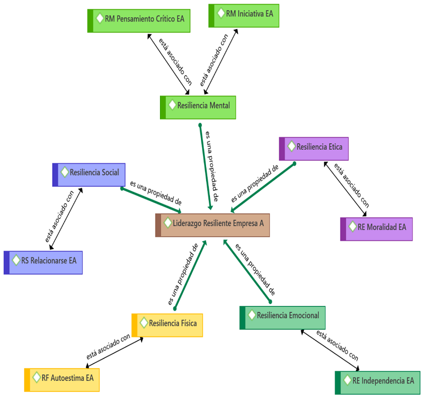Con la asignación de códigos se llevó a cabo el análisis de contenido de las entrevistas y de las guías de observación para encontrar las características del liderazgo resiliente por empresa y, en conjunto, se representaban en las redes semánticas. Como ejemplo de estas redes se presenta la elaborada con los datos de la empresa A en la Figura 1.