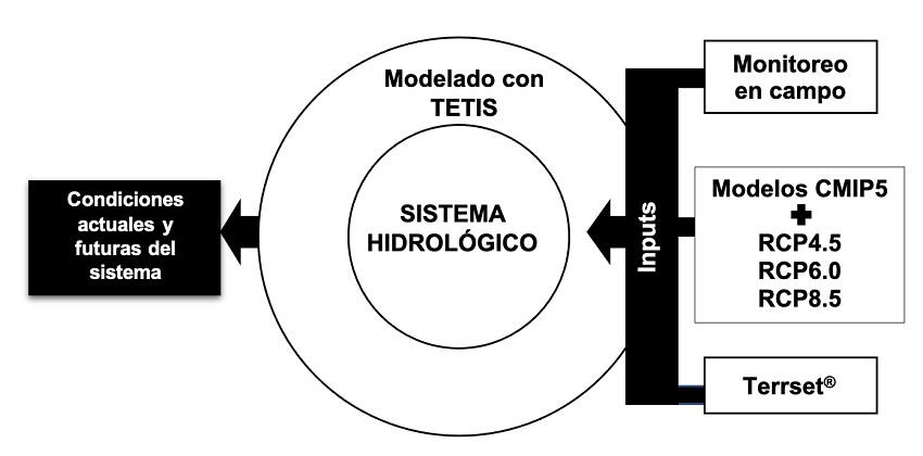 La metodología diseñada considera el acoplamiento del monitoreo en campo, el modelo hidrológico distribuido TETIS (Francés et al., 2007), los Modelos de Circulación General (GCM, por sus siglas en inglés) y los escenarios de Gases Efecto Invernadero (GEI) del Grupo Intergubernamental de Expertos sobre el Cambio Climático (IPCC, por sus siglas en inglés). Finalmente, se ha usado el software Terrset® para la proyección de los cambios de uso de suelo (Figura 1). En Orozco et al. (2020), se puede encontrar una descripción más detallada de los modelos y herramientas usadas en la investigación.