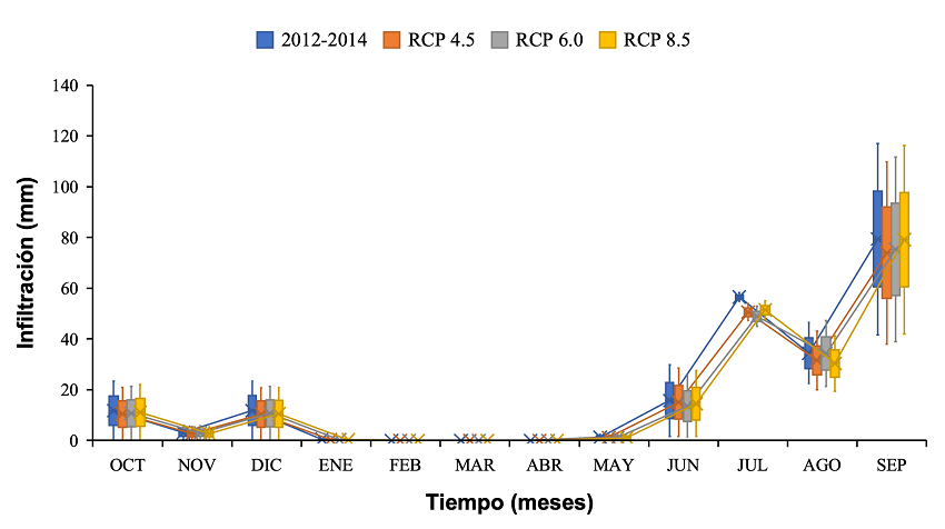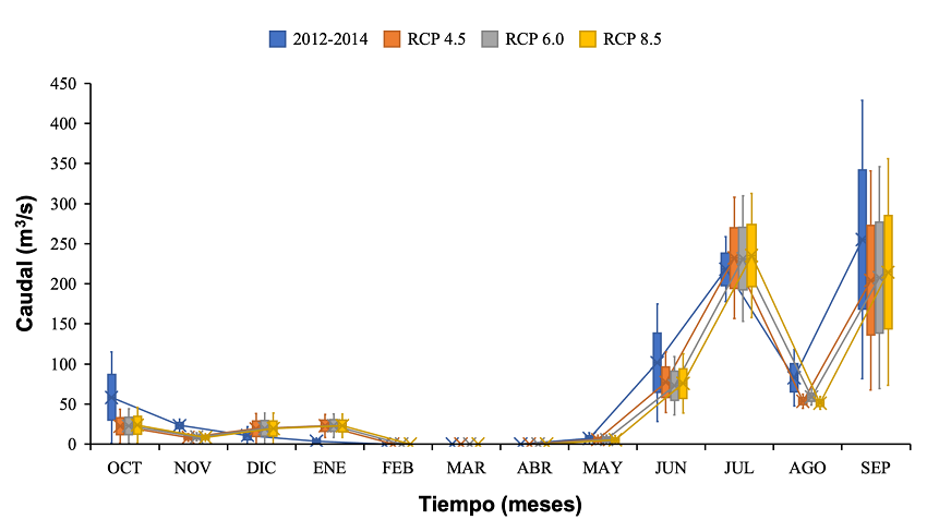 Los pronósticos para el año 2035 obtenidos muestran efectos significativos en varios procesos del ciclo hidrológico. Por ejemplo, se prevén cambios en la escorrentía superficial durante el periodo de lluvias (Figura 9). Para los tres escenarios RCP se observa un incremento significativo de la escorrentía superficial en el mes de julio respecto del comportamiento medio registrado en el periodo de control (2012-2014), a pesar de que los pronósticos climáticos prevén una disminución de las precipitaciones. Es decir, no se correlaciona con una disminución de las intensidades de los eventos de precipitación. En el mismo contexto, se observa también incrementos en el mes de enero de aproximadamente 46 m3/s. Estas variaciones para los escenarios RCP están directamente relacionadas con las precipitaciones estimadas y los cambios de uso de suelo estimados con Terrset® (Tabla 3).