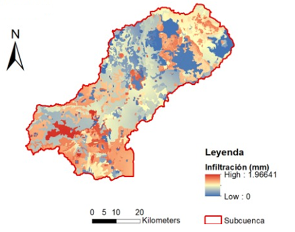 La nueva hidrodinámica superficial se traduce en disminuciones en el proceso de infiltración, como se puede observar en la Figura 10. Lo anterior dilucida por consiguiente una disminución de la percolación en la subcuenca (Tabla 4). Para poder evaluar los impactos de las zonas urbanas y el cambio climático se analizaron espacialmente los procesos y almacenamientos en la subcuenca. Para ello, se crearon mapas con los valores medios de los flujos y almacenamientos obtenidos de las simulaciones para el año 2035. En la Figura 11 se puede observar que en las áreas urbanas tanto la infiltración y percolación presentan valores de cero o muy cercanos a cero.