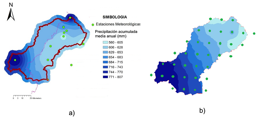 La información usada en el modelado hidrológico distribuido ha consistido en datos diarios de precipitación y temperatura, obtenidos de 10 estaciones meteorológicas que opera el Servicio Meteorológico Nacional (SMN) de México. Sin embargo, con la finalidad de mejorar los inputs del modelo hidrológico y evitar inconsistencias en la interpolación de las variables meteorológicas, se ha decidido usar el Multi Source Weighted-Ensemble Precipitation (MSWEP). Con lo anterior, se pasó de tener 10 estaciones a 36 estaciones virtuales con una buena aproximación a los datos de precipitación observados en el periodo del 2000 al 20141 (Figura 2 y 3).