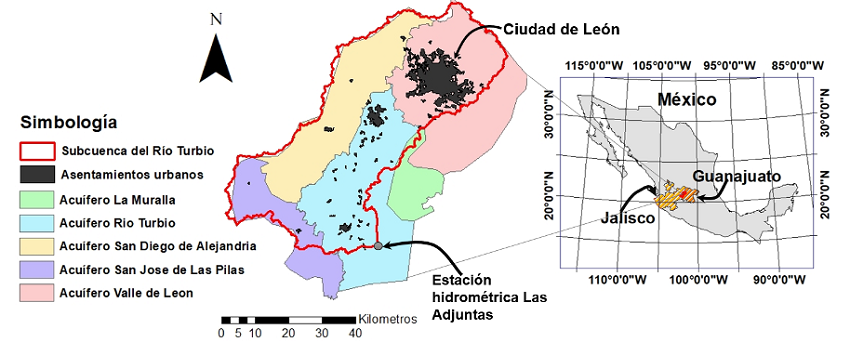 El área de estudio seleccionada ha sido la subcuenca del río Turbio, la cual se ubica en los estados de Guanajuato y Jalisco, México (Figura 4). La subcuenca tiene un área de 2983 km2, y se ha utilizado como caso de estudio en Orozco et al. (2020) y Orozco & Ramos (2020). Como se puede observar en la Figura 4, la subcuenca comprende los acuíferos La Muralla, Río Turbio, San Diego de Alejandría, San José de Las Pilas y Valle de León.