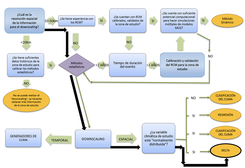 En la presente investigación se ha realizado un downscaling estadístico empleando las proyecciones de los GCM y los datos de las variables observadas en el área de estudio para pasar de una escala regional a una local. Dichos modelos se ajustan utilizando datos actuales del clima, posteriormente, son aplicados para proyectar regionalmente futuros cambios climáticos a partir de los datos que se tienen de los GCM (Wilby et al., 2004). En esta investigación se ha seleccionado el método estadístico delta, de acuerdo con el diagrama de Trzaska et al. (2014), al ser el que mejor se adapta a la capacidad computacional y la calidad de los datos (Figura 5).
