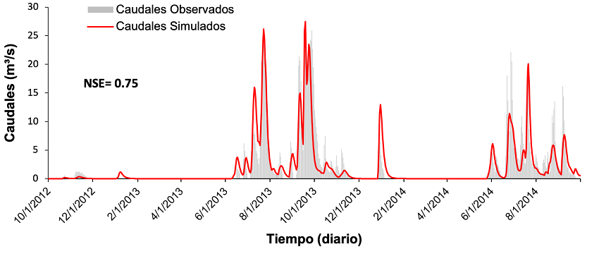 En la calibración y validación del modelo TETIS se ha usado como función objetivo el índice de Eficiencia de Nash-Sutcliffe (NSE, por sus siglas en inglés). El modelo hidrológico TETIS calibrado ha alcanzado una eficiencia de 0.74 de NSE en la reproducción de los caudales observados en la estación Las Adjuntas (Figura 6). El periodo seleccionado para la calibración ha comprendido del 01 de octubre de 2012 al 30 de septiembre de 2014, al representar el patrón de lluvias más frecuente en la subcuenca del río Turbio. Asimismo, se utilizaron sólo dos años hidrológicos con la finalidad de reducir el tiempo de cómputo de la calibración automática con el algoritmo Shuffled Complex Evolution desarrollado por la Universidad de Arizona (SCE-UA).