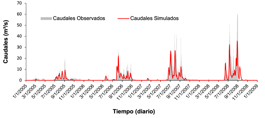 En el caso de la validación temporal realizada al modelo se usaron cuatro años hidrológicos (01 de octubre de 2005 al 30 de septiembre de 2009), obteniéndose un NSE de 0.64, que es aceptable de acuerdo con Moriasi et al. (2007).