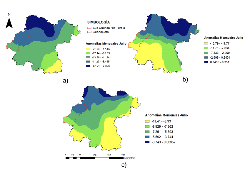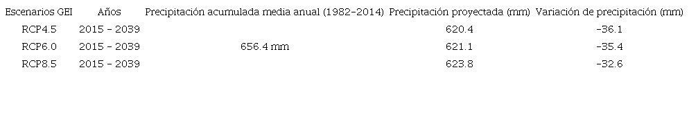 Utilizando los datos de precipitación mensual de la base histórica (1982-2014), se aplicó la técnica downscaling para cada estación meteorológica con la finalidad de realizar la proyección sobre la variabilidad de la precipitación y temperatura bajo los efectos del cambio climático para el futuro cercano (año 2035). Al comparar los datos de precipitación anual de la base histórica respecto a los datos proyectados para los escenarios de cambio climático, se observan disminuciones para los tres escenarios GEI (Tabla 2). Específicamente, en el mes de julio los tres escenarios RCP pronostican las mayores anomalías (Figura 8). Lo anterior se debe a que las proyecciones de los GCM del CMIP5 pronostican disminuciones generalizadas de las precipitaciones afectadas por la media de las anomalías.