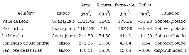 Según Orozco et al. (2020), la precipitación acumulada media anual en la subcuenca del río Turbio varía de 560 mm a 807 mm. Sin embargo, las principales demandas de agua en la producción de granos, forrajes, hortalizas y especias, además del abastecimiento urbano, han provocado que los acuíferos presenten estrés hídrico con déficits de 3.06 hm3 a 53.88 hm3 (Tabla 1). Según el Diario Oficial de la Federación (DOF, 2020), cuatro de los cinco acuíferos se han declarado sobreexplotados (Tabla 1). De acuerdo con la Ley Federal de Derechos de Agua del 2015, los cinco acuíferos presentan condiciones de veda, disponibilidad 0 y 1 (Tabla 1).