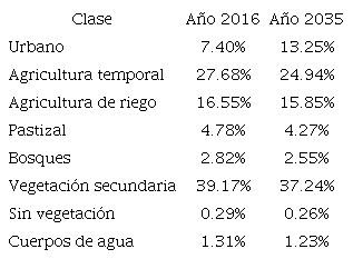 El pronóstico para el año 2035 realizado con Terrset® muestra una disminución de los porcentajes de ocupación respecto del uso de suelo del año 2016, a excepción de los núcleos urbanos, los cuales aumentarán un 5.85% (Tabla 3). Según el pronóstico con Terrset®, el área urbana de la ciudad de León aumentará un 15.6%.