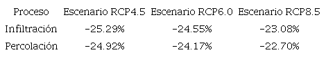 Al interpretar los resultados obtenidos en esta investigación, se puede concluir que la precipitación disminuirá, por lo que la capacidad de almacenamiento capilar del suelo se verá reducida principalmente en las zonas urbanas y las áreas agrícolas. Asimismo, se generará un escurrimiento superficial más rápido, reduciéndose los tiempos de permanencia del agua en superficie, reflejándose en menores infiltraciones y, por ende, menor percolación del sistema. Bajo condiciones de cambio climático, se estima que la recarga de los acuíferos en la zona de estudio disminuirá entre un 22.7% y un 24.9%.