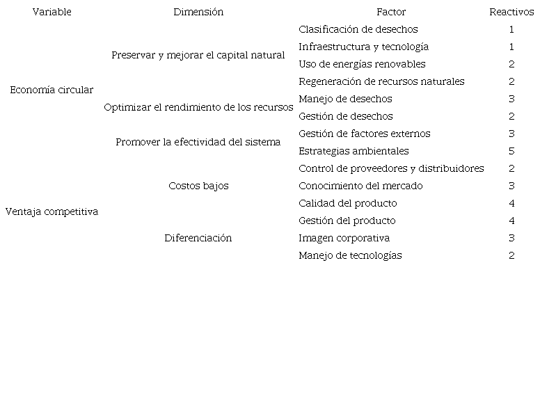 En este estudio se realizó una investigación mixta, la cual es un proceso que implica la recolección y el análisis de datos cuantitativos y cualitativos, pero con preponderancia cuantitativa (Hernández-Sampieri & Mendoza, 2018). Las variables estudiadas fueron economía circular y ventaja competitiva. Con base en la teoría, para la primera variable, las dimensiones analizadas fueron preservar y mejorar el capital natural, optimizar el rendimiento de los recursos y promover la efectividad del sistema, analizando los factores clasificación de desechos, infraestructura y tecnología, uso de energías renovables, regeneración de recursos naturales, manejo de desechos, gestión de desechos, gestión de factores externos y estrategias ambientales. Las dimensiones y factores de la primera variable se propusieron tomando como referencia los principios de economía circular de la Fundación de Ellen MacArthur (Ellen MacArthur Foundation, 2015). Para la segunda variable, las dimensiones analizadas fueron costos bajos y diferenciación, analizando los factores control de proveedores y distribuidores, conocimiento del mercado, calidad del producto, gestión del producto, imagen corporativa y manejo de tecnologías. Las dimensiones y factores de la segunda variable se propusieron considerando los criterios de los dos tipos básicos de ventaja competitiva de Michael Porter (Porter, 2007, 2016) (Tabla 2).