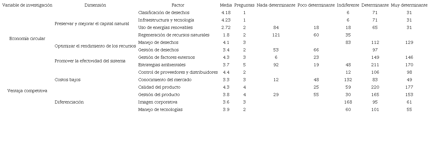 En los resultados del análisis estadístico descriptivo mostrados en la Tabla 3, se observó que en la variable economía circular, en la dimensión preservar y mejorar el capital natural, los factores analizados clasificación de desechos e infraestructura y tecnología fueron percibidos como determinantes al presentar una media aritmética de 4.18 y 4.23, respectivamente; mientras que el uso de energías renovables (2.72) y regeneración de recursos naturales (1.8) fueron percibidas con tendencia a indiferente y poco determinante.