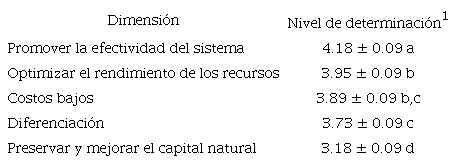 En la dimensión optimizar el rendimiento de los recursos, el factor analizado manejo de desechos (implementación de acciones para reducir o dar un nuevo uso a los desechos) fue percibido como determinante al presentar una media de 4.1, y el factor gestión de desechos (que los residuos se vendan como materia prima a otras empresas) fue considerado con tendencia a indiferente (3.4).