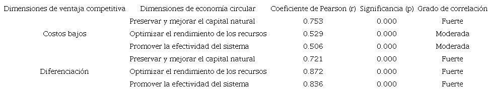 Siguiendo la metodología planteada, los resultados obtenidos del análisis de correlación de Pearson se presentan en la Tabla 5, donde las dimensiones de economía circular: preservar y mejorar el capital natural, optimizar el rendimiento de los recursos y promover la efectividad del sistema presentaron correlaciones significativas fuertes con la dimensión de ventaja competitiva diferenciación. Sin embargo, con la dimensión de ventaja competitiva costos bajos, solamente se presentó una correlación significativa fuerte con la dimensión de economía circular preservar y mejorar el capital natural.