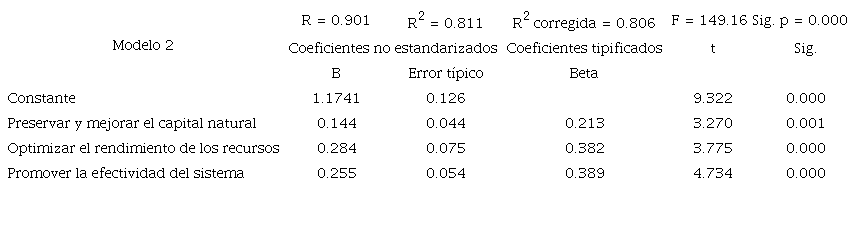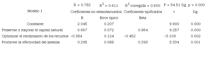 En la Tabla 6, donde se muestra el resumen del modelo 1 de regresión múltiple con la variable dependiente costos bajos, se observa un coeficiente de determinación R2 = 0.60, lo que revela que el 60% de la percepción de la variable dependiente costos bajos es explicada por las tres variables independientes. El Anova presentó una distribución F = 54.51 con p = 0.000, lo que indica la existencia de una tendencia significativa y, en este caso, que al menos una variable influye significativamente en el modelo. De los coeficientes Beta, se observa que a pesar de que los tres tienen una significancia p menor a 0.05, la variable preservar y mejorar el capital natural ocupa el 86.4% de importancia en el modelo, siendo la más determinante, lo cual se confirma con la ecuación de regresión (1), en donde solo la dimensión preservar y mejorar el capital natural influye significativamente en la variable dependiente costos bajos.