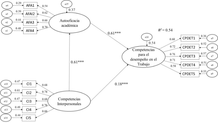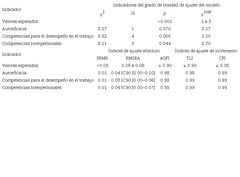 El valor de fiabilidad compuesta para el modelo (CR = 0.81) reporta un valor dentro de los estándares aceptados (Hu & Bentler, 1999). Los valores de los índices de ajuste también fueron satisfactorios, lo que sugiere que el modelo teórico se sustenta en los datos (χ2 = 149.81; gl = 67; p = 0.000; CMIM/DF = 2.23; SRMR = 0.03; AGFI = 0.97; TLI = 0.97; CFI = 0.98; RMSEA = 0.03; IC 90 [0.02-0.04]). El modelo de ecuaciones estructurales explicó el 54% de la varianza de los indicadores que se midieron para las competencias auto percibidas sobre el desempeño para el trabajo.