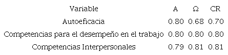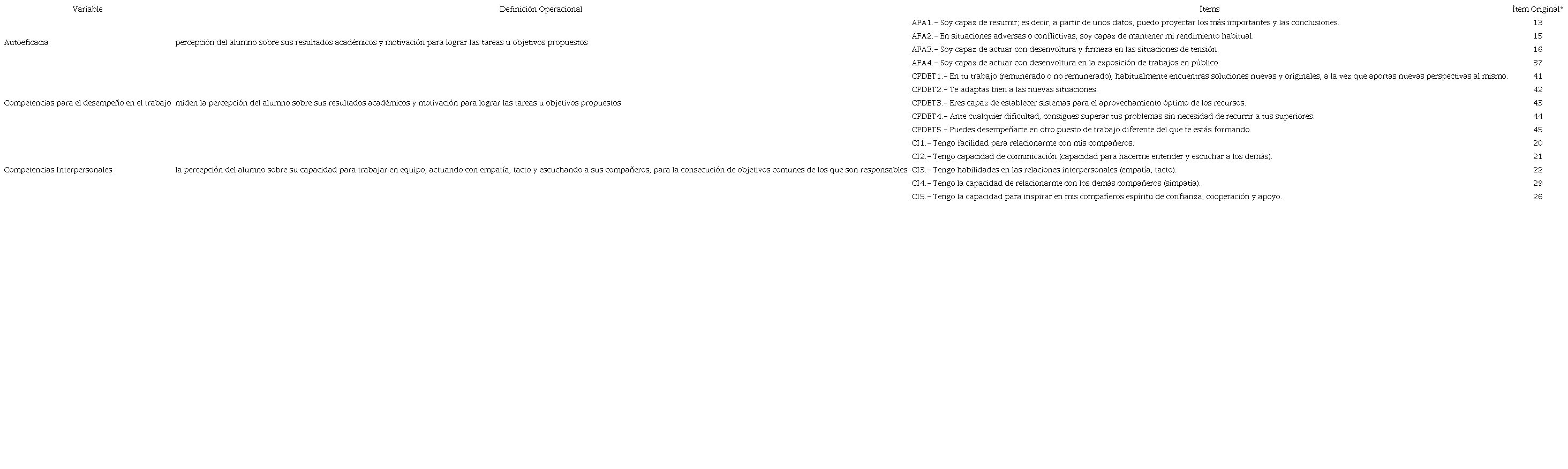 Con relación a los constructos que se presentan en la escala original de Solanes et al. (2008), la autoeficacia forma parte de la variable competencias sistémicas, las competencias para el desempeño en el trabajo forman parte de la variable competencias instrumentales y, por último, se consideró casi en su totalidad la variable competencias interpersonales. El instrumento se contestó en un formato tipo Likert con cinco opciones de respuesta: 1 = casi nunca, 2 = ocasionalmente, 3 = varias veces, 4 = con frecuencia y 5 = siempre. Se verificaron para las tres variables los valores de fiabilidad y validez de los datos. La operacionalización de las variables se presenta en la Tabla 2.