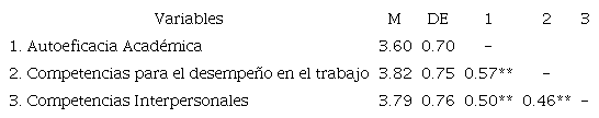 Al realizar el análisis de correlación de las tres variables se reporta una correlación positiva al nivel 0.01 entre ellas, en donde la correlación mayor se da entre la autoeficacia académica y las competencias para el desempeño en el trabajo (Tabla 5).