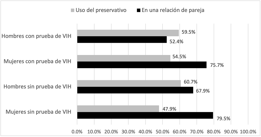 De la información recolectada se desprende que la orientación sexual más reportada entre las y los participantes fue la heterosexual. Del grupo de hombres que se hicieron un diagnóstico de VIH, los varones homo/bisexuales fueron mayoría, no así las mujeres lésbicas o bisexuales. La Figura 1 señala que el uso del preservativo en la última relación sexual es mayormente reportado por los varones. Las mujeres y quienes no se han practicado en el último año la prueba serológica indicaron en mayor medida estar en una relación de pareja.