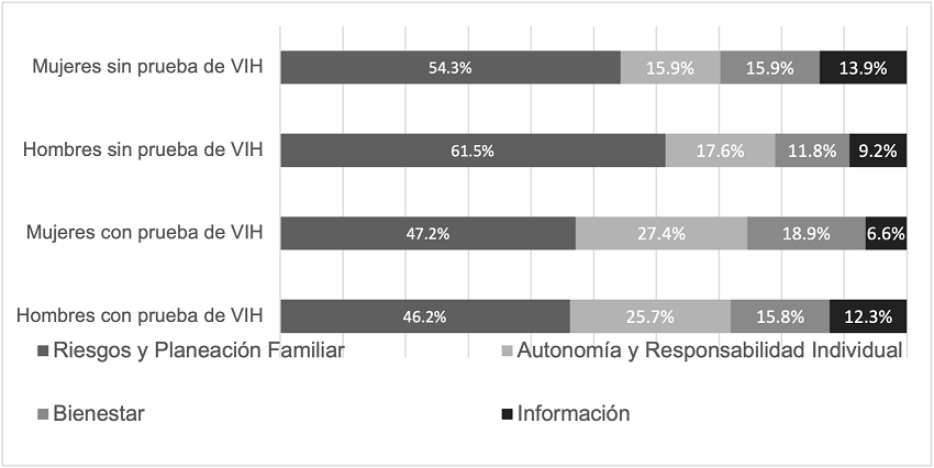 Hay diferencias en la importancia de los conceptos que definen las representaciones sobre salud sexual, a partir de si estas mujeres y hombres jóvenes se habían realizado o no un examen de detección de VIH. Aquellos jóvenes que accedieron a la prueba, entendieron la salud sexual desde una perspectiva que integraba al modelo biomédico significados relacionados con los afectos y el autocuidado. Para quienes la prueba de VIH no era una práctica común, la salud sexual fue concebida desde referencias biomédicas e informativas y haciendo hincapié en la responsabilidad individual.