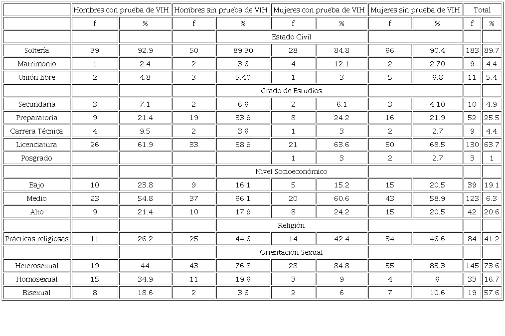 Para los análisis comparativos se construyeron cuatro grupos: (1) hombres que se habían realizado la prueba de VIH (20.6%, n = 42), (2) hombres que no se habían realizado la prueba de VIH (27.5%, n = 56), (3) mujeres que se realizaron la prueba de VIH (16.2%, n = 33) y (4) mujeres que no se habían realizado la prueba de VIH (35.8%, n = 73). Sus principales características sociodemográficas se presentan en la Tabla 1, donde se observa una representación relativamente homogénea de las condiciones socioculturales entre grupos.