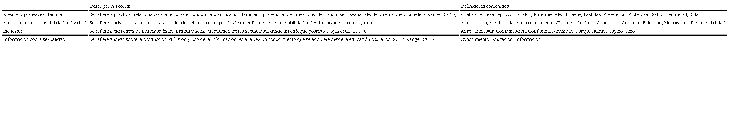 Para establecer las palabras con las que las y los participantes construyen cada representación social, se estableció como punto de corte aquellas palabras definidoras cuyo porcentaje de frecuencia de aparición en el grupo fuese mayor al 10%, esto con la finalidad de asegurarse de que se trata de elementos consensuados y representativos del grupo (Hinojosa, 2008). Para el análisis de la estructura, se identificaron las palabras que alcanzaron el punto de corte en cada representación social, clasificadas a partir de su rango de importancia y frecuencia para determinar las hipótesis estructurales de las representaciones (Dany et al., 2015). Los elementos más salientes, es decir, con una frecuencia e importancia alta, se consideraron parte del núcleo central de cada representación social. Para el análisis del contenido, se examinaron las cualidades semánticas de las palabras contenidas en la representación a través de una categorización por áreas teóricas iniciales (Domínguez et al., 2003, como se citó en Trejo & Díaz, 2017), la cual se puede ver en la Tabla 2, que también incluye una categoría que emergió al momento de hacer el análisis.