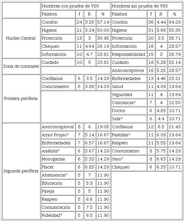 El elemento saliente o prominente en su expresión fue condón para ambos grupos de varones, este fue el mencionado con mayor frecuencia por los participantes. Sobre la definidora de mayor valor simbólico, o sea la más importante para el grupo, fue la protección en los hombres con prueba de VIH y la responsabilidad en aquellos sin la prueba.
