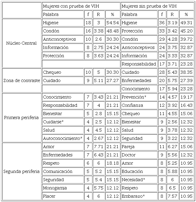 Sobre los núcleos centrales, las mujeres con examen de VIH lo acotaron desde higiene, condón, anticonceptivos, protección (palabras asociadas a una prevención de riesgos) e información (que indica la importancia de saberes en torno a la temática). Aunque con variaciones en sus valores, las mujeres sin el test elaboraron las mismas definidoras para su núcleo, agregando la responsabilidad como compromiso individual.