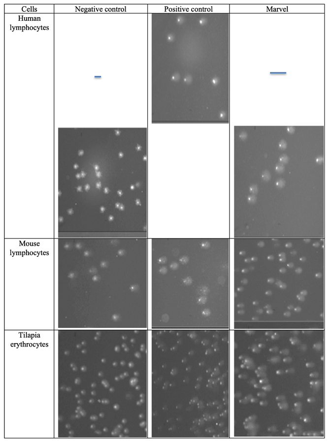 The comet assay was carried out using total blood of human, mice, and tilapia, following the procedures described by Singh et al. (1988) and Alvarez-Moya et al. (2001). Each blood sample previously obtained was divided into four parts. Then, each part was mixed (v/v) with a different final concentration of the marvel (0.76 μl/1 ml, 7.68 μl/1 ml, 76.8 μl/1 ml, and 768 μl/1 ml) for 6 h at 25 °C. Untreated cells, resuspended in 500 μl of PBS, were used as negative controls; on the contrary, cells treated with a final concentration of NDEA at 5 mM were used as positive controls. After that, all samples were washed three times with PBS and centrifuged at 3000 rpm for 10 min. Later, the pellet was resuspended in 100 μl of PBS and subsequently placed on agarose gels. This procedure was performed in duplicate slides for each sample of the three species used. For the nuclear lysis, all slides were immersed in a lysis buffer (2.5 M NaCl, 100 mM Na2 EDTA, 10 mM Tris-HCl, 1% sodium lauryl sarcosine, 1% Triton X-100, and 10% DMSO, pH 10) for 2 h at 4 °C and then washed with distilled water. Furthermore, the slides were placed in a horizontal electrophoresis system (Bio-Rad, model A6) containing electrophoresis buffer (NaOH 300 mM, EDTA 1 mM, pH 13) for 45 min at 4 °C to allow the DNA to unfold. Afterwards, the electrophoresis was carried out for 20 min at 1.0 V/cm with an amperage of ~300 mA (Labconco, model 4333280). The same electrophoretic unit and power supply were used throughout the study. After the electrophoresis was carried out, all slides were gently washed with distilled water to remove the alkaline solution. Then, they were all immersed in a neutralization buffer (0.4 M Tris base, pH 7.5) for 5 min. The gels were stained with ethidium bromide (100 μl at 20 μg/ml) for 3 min and then washed three times using distilled water to remove possible bromide residues. The slides were analyzed using a fluorescence microscope (Zeiss, model Axioskop 40) with a 515-560 nm excitation filter. Comets were observed at 40X, and their tail length was determined using the comet assay II software (Zeeiz Sinoptic Mikro S.A De C.V. México, 2012), which automatically indicates the start and the end of the comet length (Ma et al., 1994). Approximately, 200 comet cells per studied subject were analyzed.