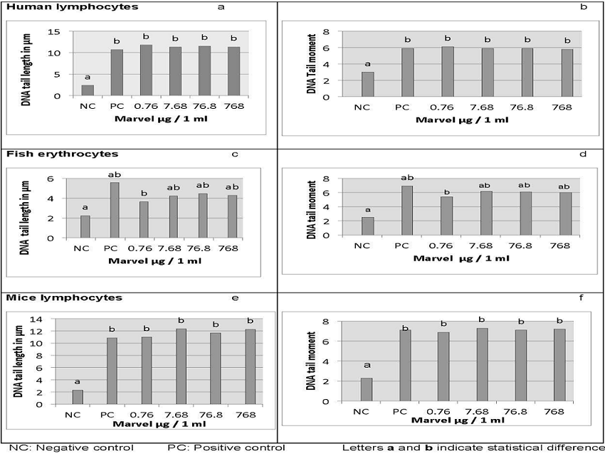 There are two parameters used in the comet test: tail length and tail moment, both parameters were used to evaluate genetic damage in the three species studied. The genotoxic activity of different concentrations of marvel in human lymphocytes is shown in Figure 2a and 2b. All concentrations showed significant genotoxic activity when compared to the negative control (p < 0.05); however, no significant difference was observed between the different marvel concentrations and the positive control.