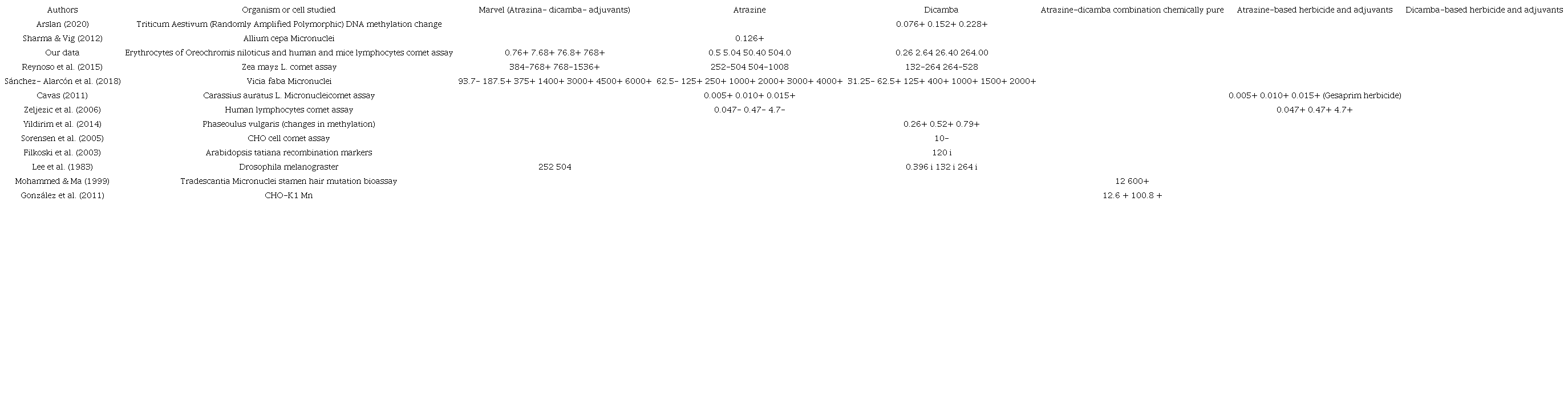 Marvel was equally genotoxic in all the cells studied, therefore, continuous exposure to this herbicide will represent a risk to all organisms, even in very low concentrations. The possible genotoxic effect of adjuvant substances (secondary diluent, solvent, dispersant, antifreeze) is not ruled out, which in the case of marvel constitute 65.32% of its weight, and they are not properly described (Marvel-Syngenta data sheet); it appears that this is a frequent situation Argüello-Rangel et al., 2015). The absence atrazine genotoxicity and presence of genotoxicity in a commercial atrazine-based herbicide Zeljezic et al., 2006) are attributed to adjuvant substances present in the commercial herbicide and suggest the need to evaluate the genotoxicity of these chemical compounds (Solomon et al., 2013). In addition, there are only few reports regarding the genotoxic evaluation of the chemically pure dicamba-atrazine combination, as shown by the empty spaces in Table 2.