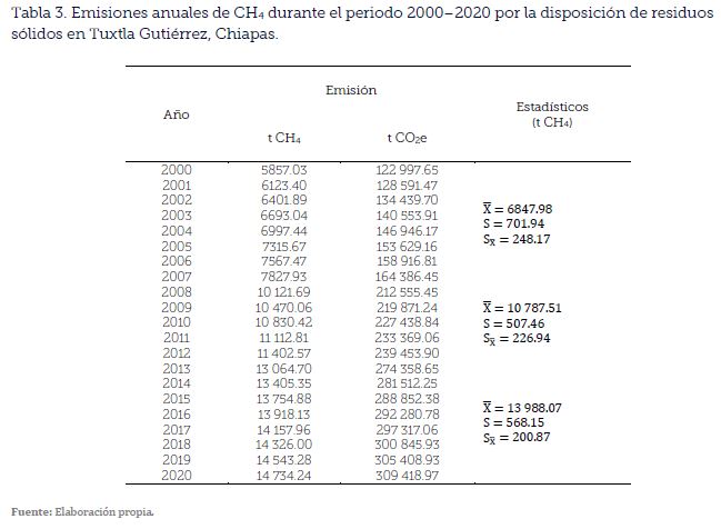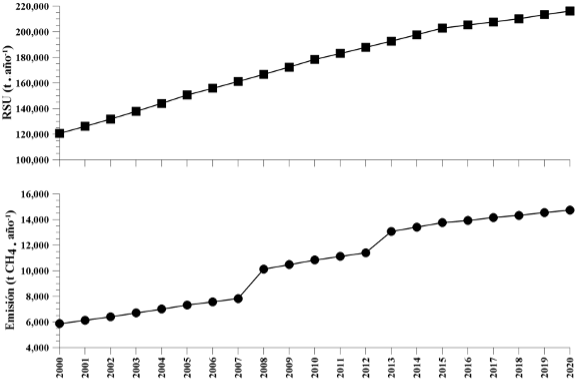 En el año 2000, se emitieron 5857.03 t CH4 (122 997.65 t CO2e) por la disposición de 120 560.02 t RSU, mientras que 14 734.24 t CH4 (309 418.97 t CO2e) fueron emitidos en el 2020 a partir de 216 137.49 t RSU. Lo anterior equivale a un incremento de 8 877.21 t CH4 (186 421.33 t CO2e) durante el periodo, observándose tasas de crecimiento que oscilan entre 1.19% y 29.3% y una media anual del 4.89% (Tabla 3).