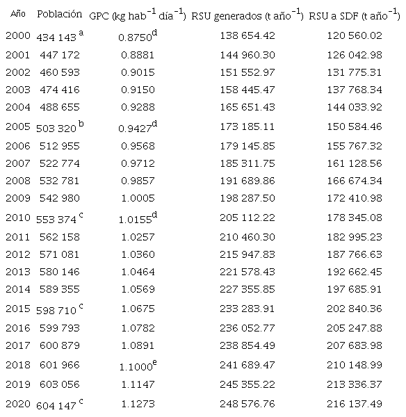 Los datos de GPC (kg hab-1 d-1) fueron tomados de Semahn (2019a) e INECC (2021). Similar a los datos de población, se aplicó el modelo geométrico de crecimiento (Torres-Degró, 2017) para complementar la serie de GPC para el periodo 2000-2020 (Tabla 1). Así, la generación anual de RSU fue obtenida mediante la siguiente ecuación: