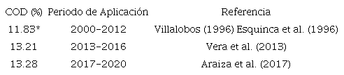 donde %COD es el porcentaje de COD en los RSU, A es el contenido de papel y los textiles en los RSU (%), B es el contenido de residuos de jardín y de los parques o de otros restos orgánicos putrescibles en los RSU (%), C es el contenido de restos de alimentos en los RSU (%) y D es el contenido de madera y paja en los RSU (%). Los valores COD obtenidos y los periodos en los que fueron aplicados se muestran en la Tabla 2.