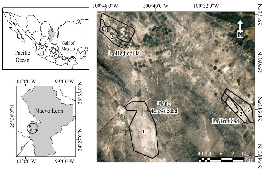 El estudio comprendió las ANP estatales La Trinidad, La Hediondilla y Llano La Soledad, con una extensión de 33.02 km2, 43.73 km2 y 76.07 km2, respectivamente, ubicadas en el municipio de Galeana, Nuevo León (Figura 1). El clima es seco con una precipitación anual de 300 mm (Guadarrama et al., 2003a, 2003b, 2003c). Las ZSCE representan un mosaico biológico de más de 200 especies de vertebrados y 284 especies de plantas (Conabio, 2008; Guadarrama et al., 2003a, 2003b, 2003c). El pastizal halófito, dominado por Muhlenbergia villiflora es la principal comunidad vegetal y está rodeado de matorral xerófilo-micrófilo, con Larrea tridentata y Flourencia cernua como componentes principales (Estrada et al., 2010).