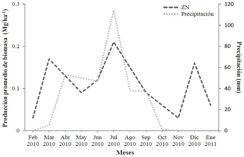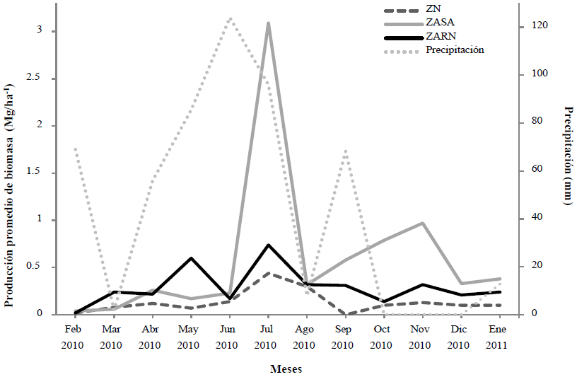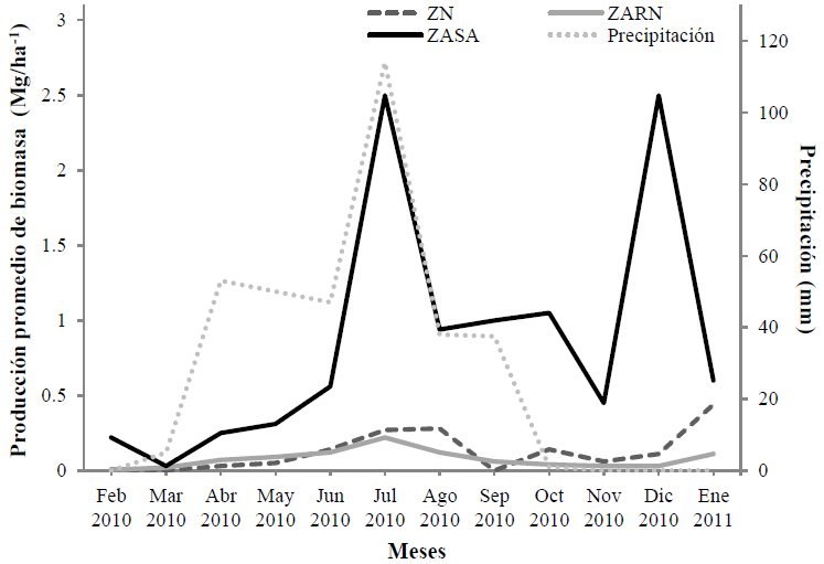 La Trinidad presentó una producción media anual de biomasa total de 0.40 Mg/ha-1 (Tabla 3). La ZN tuvo una mayor producción promedio en julio con 0.44 Mg/ha-1 (Figura 2), en tanto que la ZASA presentó dos picos de producción: uno en julio (3.09 Mg/ha-1) y otro en noviembre (0.97 Mg/ha-1), además fue la zona de manejo con mayor producción anual de biomasa, promediando 0.65 Mg/ha-1 (Tabla 3). La ZARN mostró mayor producción de biomasa en el mes de julio con una media de 0.74 Mg/ha-1 (Figura 2). De acuerdo con las diferentes comunidades vegetales presentes en La Trinidad, la biomasa de plantas invasoras fue la de mayor producción anual dentro del área (2.01 Mg/ha-1) (Tabla 3). Con relación a zonas de manejo, la ZN de La Trinidad registró un promedio anual de 0.20 Mg/ha-1 de biomasa de pastizal, en tanto que la ZASA tuvo una producción anual de plantas invasoras de 2.56 Mg/ha-1 (Tabla 3). La ZARN produjo una media anual de biomasa de pastizal de 0.98 Mg/ha-1, seguida de 0.89 Mg/ha-1 de biomasa de vegetación invasora (Tabla 3).
