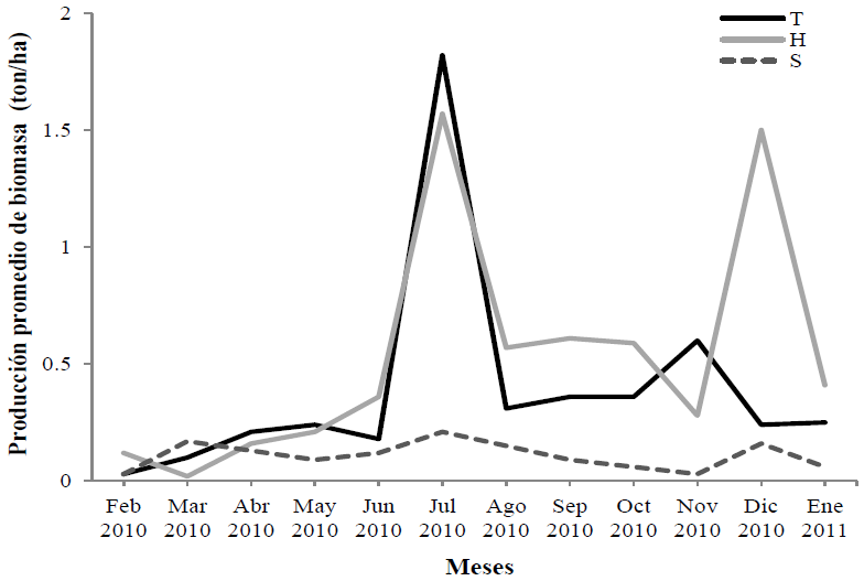La producción promedio anual de biomasa total en el Llano La Soledad fue de 0.11 Mg/ha-1 (Tabla 3). Durante los meses evaluados se presentaron diversos incrementos de biomasa aérea: en marzo con una media de 0.17 Mg/ha-1, en julio 0.21 Mg/ha-1 y en diciembre 0.16 Mg/ha-1 (Figura 4). En esta área protegida se registraron únicamente biomasa de arbustos y de pastizal, de las cuales destacó la segunda con 0.14 Mg/ha-1 de producción media anual (Tabla 3).