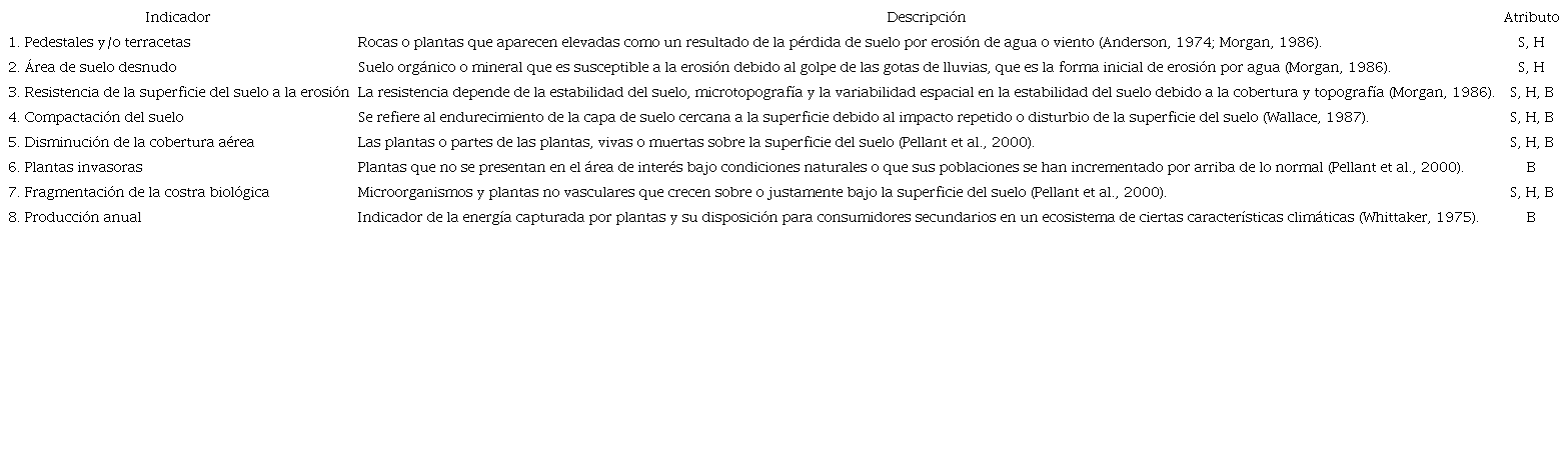 Se evaluó mensualmente (de febrero de 2010 a enero de 2011) la condición de la salud del ecosistema de las tres ZSCE. De forma sistemática, se establecieron transectos y parcelas permanentes en las que se seleccionaron y evaluaron ocho indicadores que determinan los atributos Estabilidad del sitio/suelo, Funcionalidad hidrológica e Integridad biótica (Tabla 1), de acuerdo con el método cualitativo sugerido por Pellant et al. (2005). Los datos de cada indicador se obtuvieron a través de la observación del grado de diferencia de la descripción del sitio ecológico, mediante las categorías descriptivas extrema (E), moderada a extrema (Mo), moderada (M), ligera a moderada (L) y nula a ligera (N) descritas para cada indicador, donde nula a ligera representa una categoría sin deterioro, mientras que extrema significa mayor deterioro (Pellant et al., 2000).